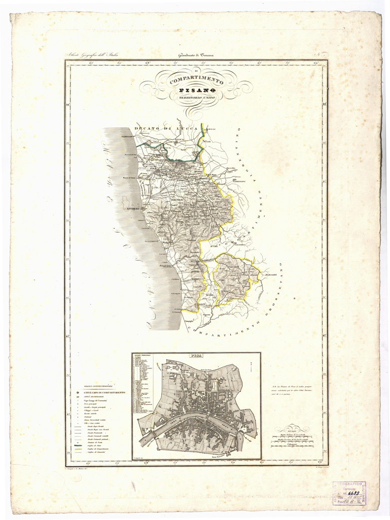 "V. Stanghi e G. Maina incisori, G. Pozzi scrisse. Nella carta è presente la pianta della città di Pisa nella proporzione di 1:12.500, incisa da V. Angeli."