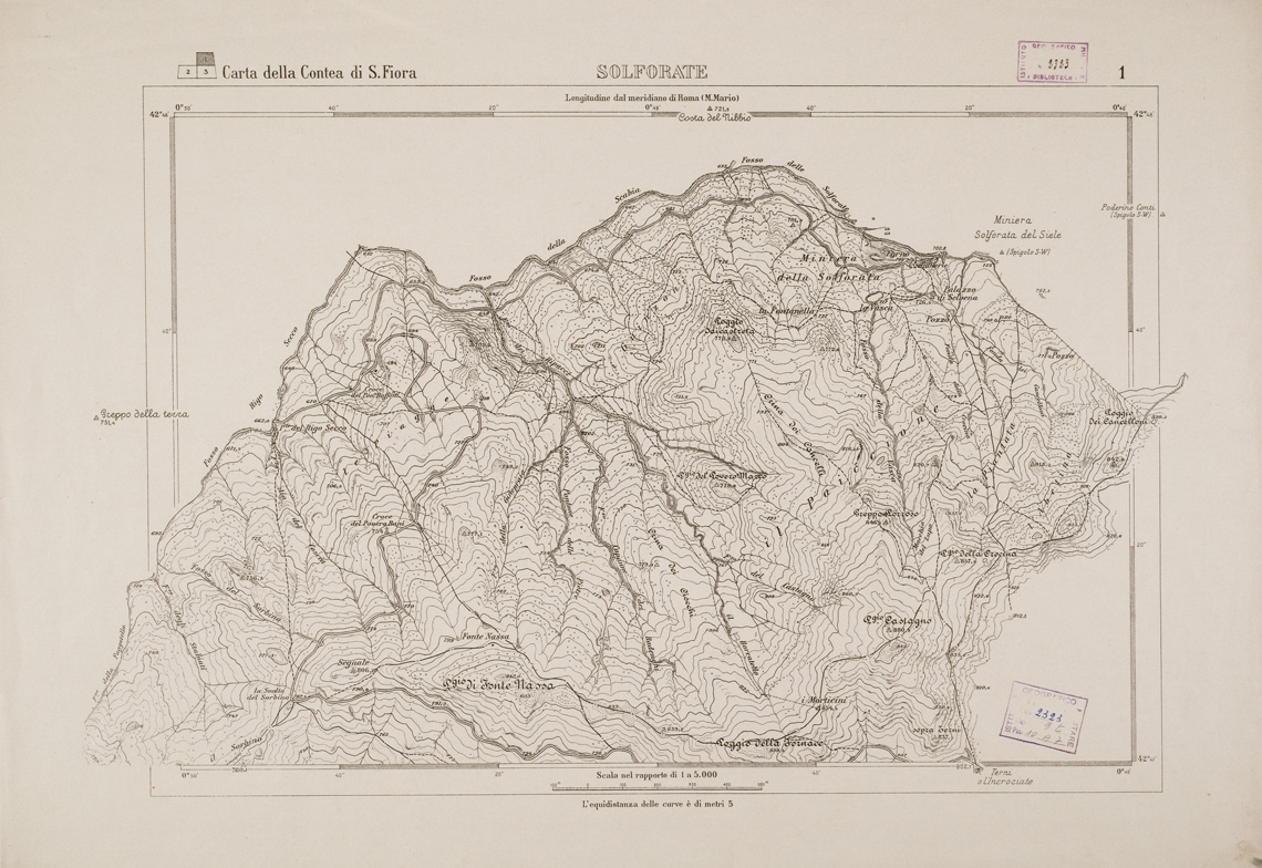 "Carta in 10 fogli stampati in nero con orografia dimostrata a mezzo di curve di livello tracciate alla equidistanza di 5 m. e curve punteggiate alla equidistanza di 1 m. La carta distingue abitati, strade (rotabili, comunali, private, non sempre praticabili, campestri, mulattiere, sentieri) acquedotti, siepi, muri, gallerie, linee d'impluvio, capisaldi, ecc. Annesso il foglio titolo con quadro d'unione, la leggenda dei segni convenzionali e la firma "Angelo Marini topografo, Firenze, dicembre 1918". Confronta anche al numero d' inventario 2323 bis " Santa Fiora IIINE " - scala 1:25.000 - edizione del 1885."