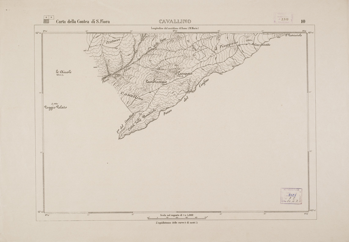 "Carta in 10 fogli stampati in nero con orografia dimostrata a mezzo di curve di livello tracciate alla equidistanza di 5 m. e curve punteggiate alla equidistanza di 1 m. La carta distingue abitati, strade (rotabili, comunali, private, non sempre praticabili, campestri, mulattiere, sentieri) acquedotti, siepi, muri, gallerie, linee d'impluvio, capisaldi, ecc. Annesso il foglio titolo con quadro d'unione, la leggenda dei segni convenzionali e la firma "Angelo Marini topografo, Firenze, dicembre 1918". Confronta anche al numero d' inventario 2323 bis " Santa Fiora IIINE " - scala 1:25.000 - edizione del 1885."