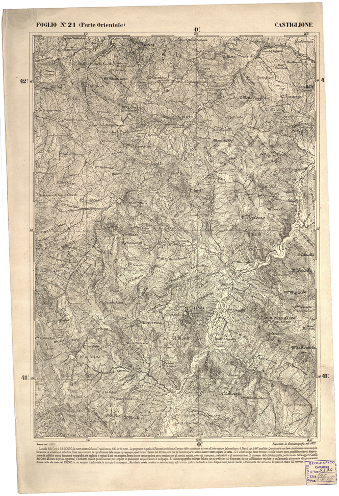 I rilevamenti topografici per la realizzazione della “Carta d´Italia&lrquo” iniziarono nel 1878: si trattava di un´opera così importante e lodevole che meritò la consapevole attenzione, non solo degli addetti ai lavori e delle categorie professionali coinvolte, ma anche delle più alte autorità del Regno.