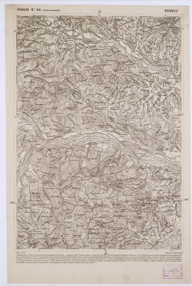 Il governo del Regno, considerando inadeguati i disomogenei lavori preunitari affidò nel 1872 all´Istituto Topografico Militare (il quale assunse l´attuale denominazione nel 1882) l´esecuzione del progetto di rilevamento generale del territorio dello Stato e della formazione della nuova Carta Topografica d´Italia alla scala 1:100000. L´Istituto, formatosi dalla fusione dell´Ufficio Tecnico del Corpo di Stato Maggiore del Regno Sardo con gli Istituti e gli Uffici topografici e cartografici dei diversi stati esistenti nella penisola prima che si compisse la sua unità politica, ereditò il materiale scientifico e cartografico preunitario caratterizzandosi di fatto come il depositario e continuatore della scuola e della tradizione cartografica nazionale.