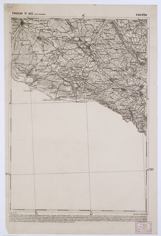 Il governo del Regno, considerando inadeguati i disomogenei lavori preunitari affidò nel 1872 all´Istituto Topografico Militare (il quale assunse l´attuale denominazione nel 1882) l´esecuzione del progetto di rilevamento generale del territorio dello Stato e della formazione della nuova Carta Topografica d´Italia alla scala 1:100000. L´Istituto, formatosi dalla fusione dell´Ufficio Tecnico del Corpo di Stato Maggiore del Regno Sardo con gli Istituti e gli Uffici topografici e cartografici dei diversi stati esistenti nella penisola prima che si compisse la sua unità politica, ereditò il materiale scientifico e cartografico preunitario caratterizzandosi di fatto come il depositario e continuatore della scuola e della tradizione cartografica nazionale.