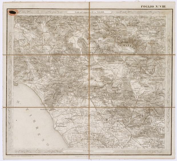 "...FOGLI 25 FOTOINCISA COL PROCEDIMENTO DEL GENERALE AVET ALLA SCALA DI 1:250.000 PUBBLICATA DALL'ISTITUTO TOPOGRAFICO MILITARE, 1874. Bella, pregevolissima carta. E' in 25 fogli oltre il foglio titolo. Su di questo sono dati i seguenti "Cenni sulla costruzione della Carta": "Questa carta corografica è tratta da una topografica disegnata a mano alla scala di 1:103.680, che si trovava negli archivi dell'ex-Ufficio Topografico di Napoli e che era dovuta allo Stato Maggiore Austriaco. Essa fu eseguita durante l'occupazione di quel Regno dal 1821 al 1824, e ne fu fondamento la nota carta del Rizzi-Zannoni, di cui la Carta Austriaca è per così dire una trasformazione. Difatti la planimetria fu poco o punto modificata ma si dette maggior rilievo all'orografia, sostituendo, previe ricognizioni sul terreno, il metodo del tratteggio a luce zenitale, a quello della prospettiva cavaliera col quale sono rappesentate le alture nelle Carte del Zannoni. Non è certamente, nè può essere un lavoro di grande esattezza geometrica, come quello che non dipende da rilievi regolari e molto meno da coordinazione di questi ad una rete di punti geodetici. Nonostante il Comitato dello Stato Maggiore credè di rendere un servizio alle varie Amministrazioni dello Stato ed al pubblico, deliberando, sin dall'anno 1868, di utilizzarla (in via transitoria e intanto che si compivano i rilievi regolari nelle provincie meridionali) con lo scopo di somministrare una guida sufficiente al militare, al geografo ed al viaggiatore. La carta fu riconosciuta sul terreno negli anni 1868-1869 onde completarvi il sistema delle strade ruotabili a fondo manufatto. Di poi si operò il disegno dei vari fogli alla scala 1:250.000, che fu adottata per la pubblicazione. Così ridotta essa consta di 25 fogli. La riproduzione ne fu eseguita con il sistema di fotoincisione del Maggior Generale Conte Avet". (vedi: N. 39 d'Ordine, Cart. d'Arch. N° 71 - Docum. N° 9021 - Files A0001415-1491, e N. 61 d' Ordine, Cart. d 'Arch. N° 72 Docum. N° 9022 - Files A0001537-1594). Alla carta è unito un quadro di unione. Due copie, una delle quali incompleta e l'altra, completa, riveduta dal 1882-1884. La carta completa si trova in biblioteca è montata su tela a stacchi n. di inventario generale 50, schedario carte generali Italia. In archivio (Cart. d'Arch. N. 90 - Docum. n. 26 - Files A0002825-2844) si trova la copia parziale delle carte (mancano i seguenti fogli: 9, 13, 15, 16, 17, 20, 25) non è montata su tela."