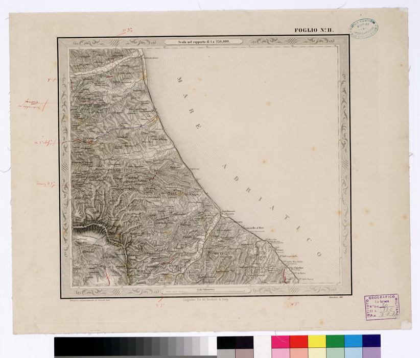 "...IN FOGLI 25 FOTOINCISA COL PROCEDIMENTO DEL GENERALE AVET ALLA SCALA DI 1:250.000 PUBBLICATA DALL'ISTITUTO TOPOGRAFICO MILITARE, 1874. Bella, pregevolissima carta. E' in 25 fogli oltre il foglio titolo. Su di questo sono dati i seguenti " Cenni sulla costruzione della Carta " : "Questa carta corografica è tratta da una topografica disegnata a mano alla scala di 1: 103.680, che si trovava negli Archivi dell ' ex- Ufficio Topografico di Napoli e che era dovuta allo Stato Maggiore Austriaco. Essa fu eseguita durante l ' occupazione di quel Regno dal 1821 al 1824, e ne fu fondamento la nota carta del Rizzi-Zannoni, di cui la Carta Austriaca è per così dire una trasformazione. Difatti la planimetria fu poco o punto modificata ma si dette un maggior rilievo all ' orografia, sostituendo, previe ricognizioni sul terreno, il metodo del tratteggio a luce zenitale, a quello della prospettiva cavaliera col quale sono rappresentate le alture nelle Carte del Zannoni. Non è certamente, né può essere un lavoro di grande esattezza geometrica, come quello che non dipende da rilievi regolari e molto meno da coordinazione di questi ad una rete di punti geodetici. Nonostante il Comitato dello Stato Maggiore credè di rendere un servizio alle varie Amministrazioni dello Stato ed al pubblico, deliberando, sin dall ' anno 1868, di utilizzarla (in via transitoria e intanto che si compivano i rilievi regolari nelle provincie meridionali) con lo scopo di somministrare una guida sufficiente al militare, al geografo ed al viaggiatore. La carta fu riconosciuta sul terreno negli anni 1868-1869 onde completarvi il sistema delle strade rotabili a fondo manufatto. Di poi si operò il disegno dei vari fogli alla scala di 1: 250.000, che fu adottata per la pubblicazione. Così ridotta essa consta di 25 fogli. La riproduzione ne fu eseguita con il sistema di fotoincisione del Maggior Generale Conte Avet ". (vedi: N. 39 d'Ordine, Cart. d'Arch. N° 71 - Docum. N° 9021 - Files A0001415-1491, e N. 61 d' Ordine, Cart. d 'Arch. N° 72 Docum. N° 9022 - Files A0001537-1594). Alla carta è unito un quadro di unione. Due copie, una delle quali incompleta e l'altra, completa, riveduta dal 1882-1884. La carta completa si trova in biblioteca è montata su tela a stacchi n. di inventario generale 50, schedario carte generali Italia. In archivio (Cart. d'Arch. N. 90 - Docum. n. 26 - Files A0002825-2844) si trova la copia parziale delle carte (mancano i seguenti fogli: 9, 13, 15, 16, 17, 20, 25) non è montata su tela."