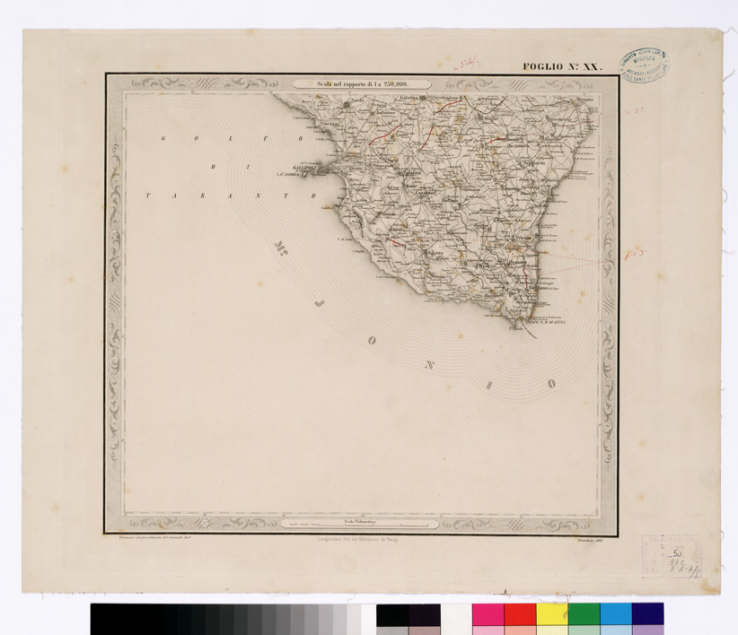 "...IN FOGLI 25 FOTOINCISA COL PROCEDIMENTO DEL GENERALE AVET ALLA SCALA DI 1:250.000 PUBBLICATA DALL'ISTITUTO TOPOGRAFICO MILITARE, 1874. Bella, pregevolissima carta. E' in 25 fogli oltre il foglio titolo. Su di questo sono dati i seguenti " Cenni sulla costruzione della Carta " : "Questa carta corografica è tratta da una topografica disegnata a mano alla scala di 1: 103.680, che si trovava negli Archivi dell ' ex- Ufficio Topografico di Napoli e che era dovuta allo Stato Maggiore Austriaco. Essa fu eseguita durante l ' occupazione di quel Regno dal 1821 al 1824, e ne fu fondamento la nota carta del Rizzi-Zannoni, di cui la Carta Austriaca è per così dire una trasformazione. Difatti la planimetria fu poco o punto modificata ma si dette un maggior rilievo all ' orografia, sostituendo, previe ricognizioni sul terreno, il metodo del tratteggio a luce zenitale, a quello della prospettiva cavaliera col quale sono rappresentate le alture nelle Carte del Zannoni. Non è certamente, né può essere un lavoro di grande esattezza geometrica, come quello che non dipende da rilievi regolari e molto meno da coordinazione di questi ad una rete di punti geodetici. Nonostante il Comitato dello Stato Maggiore credè di rendere un servizio alle varie Amministrazioni dello Stato ed al pubblico, deliberando, sin dall ' anno 1868, di utilizzarla (in via transitoria e intanto che si compivano i rilievi regolari nelle provincie meridionali) con lo scopo di somministrare una guida sufficiente al militare, al geografo ed al viaggiatore. La carta fu riconosciuta sul terreno negli anni 1868-1869 onde completarvi il sistema delle strade rotabili a fondo manufatto. Di poi si operò il disegno dei vari fogli alla scala di 1: 250.000, che fu adottata per la pubblicazione. Così ridotta essa consta di 25 fogli. La riproduzione ne fu eseguita con il sistema di fotoincisione del Maggior Generale Conte Avet ". (vedi: N. 39 d'Ordine, Cart. d'Arch. N° 71 - Docum. N° 9021 - Files A0001415-1491, e N. 61 d' Ordine, Cart. d 'Arch. N° 72 Docum. N° 9022 - Files A0001537-1594). Alla carta è unito un quadro di unione. Due copie, una delle quali incompleta e l'altra, completa, riveduta dal 1882-1884. La carta completa si trova in biblioteca è montata su tela a stacchi n. di inventario generale 50, schedario carte generali Italia. In archivio (Cart. d'Arch. N. 90 - Docum. n. 26 - Files A0002825-2844) si trova la copia parziale delle carte (mancano i seguenti fogli: 9, 13, 15, 16, 17, 20, 25) non è montata su tela."