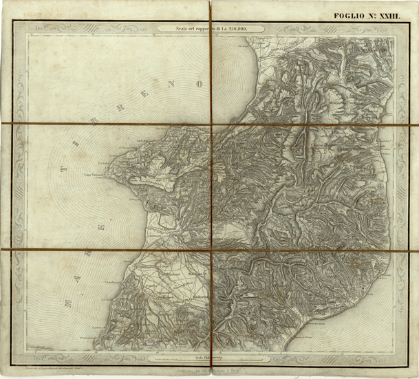 "...IN FOGLI 25 FOTOINCISA COL PROCEDIMENTO DEL GENERALE AVET ALLA SCALA DI 1:250.000 PUBBLICATA DALL'ISTITUTO TOPOGRAFICO MILITARE, 1874. Bella, pregevolissima carta. E' in 25 fogli oltre il foglio titolo. Su di questo sono dati i seguenti " Cenni sulla costruzione della Carta " : "Questa carta corografica è tratta da una topografica disegnata a mano alla scala di 1: 103.680, che si trovava negli Archivi dell ' ex- Ufficio Topografico di Napoli e che era dovuta allo Stato Maggiore Austriaco. Essa fu eseguita durante l ' occupazione di quel Regno dal 1821 al 1824, e ne fu fondamento la nota carta del Rizzi-Zannoni, di cui la Carta Austriaca è per così dire una trasformazione. Difatti la planimetria fu poco o punto modificata ma si dette un maggior rilievo all ' orografia, sostituendo, previe ricognizioni sul terreno, il metodo del tratteggio a luce zenitale, a quello della prospettiva cavaliera col quale sono rappresentate le alture nelle Carte del Zannoni. Non è certamente, né può essere un lavoro di grande esattezza geometrica, come quello che non dipende da rilievi regolari e molto meno da coordinazione di questi ad una rete di punti geodetici. Nonostante il Comitato dello Stato Maggiore credè di rendere un servizio alle varie Amministrazioni dello Stato ed al pubblico, deliberando, sin dall ' anno 1868, di utilizzarla (in via transitoria e intanto che si compivano i rilievi regolari nelle provincie meridionali) con lo scopo di somministrare una guida sufficiente al militare, al geografo ed al viaggiatore. La carta fu riconosciuta sul terreno negli anni 1868-1869 onde completarvi il sistema delle strade rotabili a fondo manufatto. Di poi si operò il disegno dei vari fogli alla scala di 1: 250.000, che fu adottata per la pubblicazione. Così ridotta essa consta di 25 fogli. La riproduzione ne fu eseguita con il sistema di fotoincisione del Maggior Generale Conte Avet ". (vedi: N. 39 d'Ordine, Cart. d'Arch. N° 71 - Docum. N° 9021 - Files A0001415-1491, e N. 61 d' Ordine, Cart. d 'Arch. N° 72 Docum. N° 9022 - Files A0001537-1594). Alla carta è unito un quadro di unione. Due copie, una delle quali incompleta e l'altra, completa, riveduta dal 1882-1884. La carta completa si trova in biblioteca è montata su tela a stacchi n. di inventario generale 50, schedario carte generali Italia. In archivio (Cart. d'Arch. N. 90 - Docum. n. 26 - Files A0002825-2844) si trova la copia parziale delle carte (mancano i seguenti fogli: 9, 13, 15, 16, 17, 20, 25) non è montata su tela."