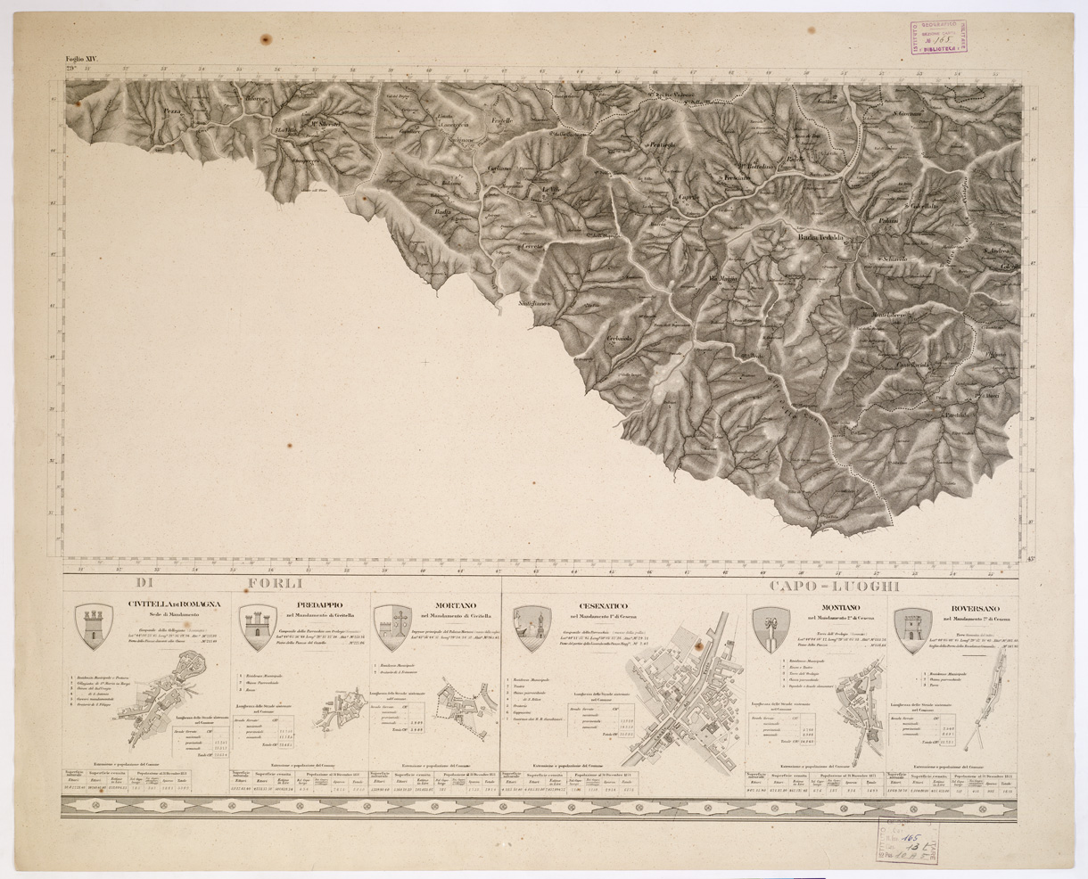 "...COL TERRITORIO DELLA REPUBBLICA DI S. MARINO E CON PARTE DI QUELLO DELLE FINITIME PROVINCIE DI FIRENZE, AREZZO, PESARO E RAVENNA. TESSUTA SOPRA UNA NUOVA RETE TRIGONOMETRICA COL MATERIALE DELLE MAPPE CATASTALI AGGIORNATE E RIDOTTE ALLA PROPORZIONE DI 1:50.000 SOTTO LA DIREZIONE DI UNA COMMISSIONE COMPOSTA DELL'INGEGNERE DAVIDE ANGELI, GIOVANNI MERLONI, FRANCESCO ANGELI E PUBBLICATA A SPESE DELLA PROVINCIA. NELL'ANNO 1888. STAB. LIT. THUMB, BOLOGNA. Carta in 16 fogli oltre un quadro d'unione. Venne costruita sulla base di una rete trigonometrica appositamente stesa. Proiezione adottata quella di Flamstead, modificata da Bonne. Longitudini calcolate dal meridiano dell'isola del Ferro. La Topografia venne ricavata per la Provincia di Forlì e parte di quella di Ravenna, dalle Mappe del Catasto Romano ridotte col pantografo dalla scala di 1:2.000 a quella di 1:10.000 e poi aggiornate a cura dei singoli comuni e della Provincia, per il territorio di S. Marino dalle mappe catastali locali, per la Provincia Pesarese da una " Corografia" alla scala di 1:32.000 conservata al Catasto in Roma e per le Provincie di Firenze ed Arezzo da " Corografie" al 20.000 e al 25.000 conservate presso la Direzione del Censimento della Toscana. La carta è stampata in nero: essa rappresenta l'orografia a mezzo di nitido tratteggio: indica abitati, ferrovie (in esercizio, in costruzione, approvate in massima), strade (nazionali, provinciali, comunali, vicinali), miniere acque minerali e termali, cave di pietra, molini, parrocchie, cimiteri, oratori, ecc., i confini di Stato, di Provincia, circondario, mandamento, di comune. Il foglio N° 1 contiene il titolo, piantine di città, un quadro delle coordinate e della altimetria dei luoghi e delle elevazioni principali, dati sulla popolazione, e sulla rete stradale e infine la leggenda dei segni convenzionali. Il foglio N° VIII reca delle " Annotazioni sulla formazione della carta". I fogli N.i IV, XIII e XVI contengono rispettivamente le piante di Rimini, Forlì e Cesena e numerose altre piantine con dati geografici e statistici. Il quadro d'unione è alla scala di 1:200 000 e contiene numerose piantine di abitati. La stessa carta è presente all'Archivio Cartografico - Cart. d'Arch. 70 - Docum. n. 9 - Files A0001390-1408."