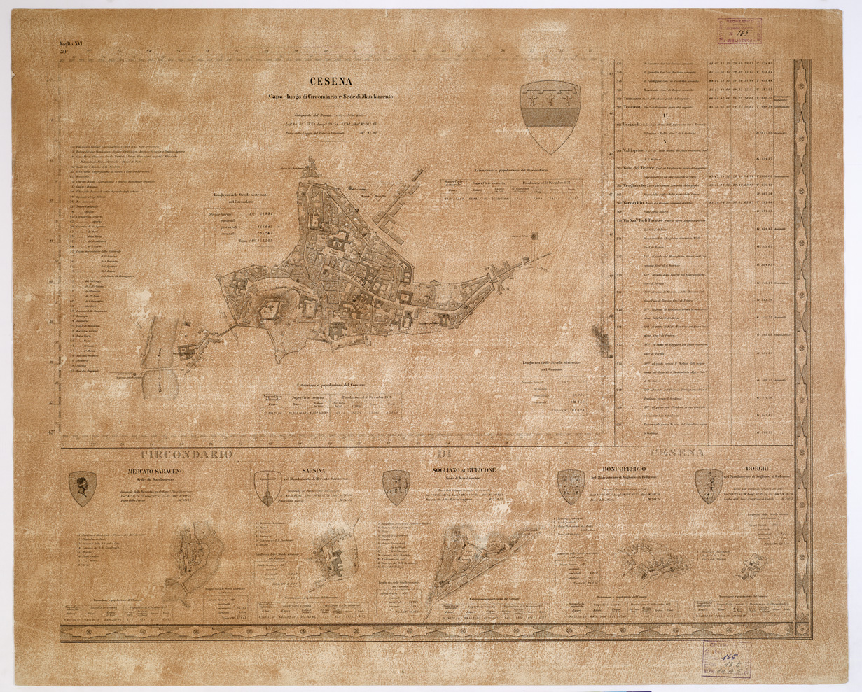 "...COL TERRITORIO DELLA REPUBBLICA DI S. MARINO E CON PARTE DI QUELLO DELLE FINITIME PROVINCIE DI FIRENZE, AREZZO, PESARO E RAVENNA. TESSUTA SOPRA UNA NUOVA RETE TRIGONOMETRICA COL MATERIALE DELLE MAPPE CATASTALI AGGIORNATE E RIDOTTE ALLA PROPORZIONE DI 1:50.000 SOTTO LA DIREZIONE DI UNA COMMISSIONE COMPOSTA DELL'INGEGNERE DAVIDE ANGELI, GIOVANNI MERLONI, FRANCESCO ANGELI E PUBBLICATA A SPESE DELLA PROVINCIA. NELL'ANNO 1888. STAB. LIT. THUMB, BOLOGNA. Carta in 16 fogli oltre un quadro d'unione. Venne costruita sulla base di una rete trigonometrica appositamente stesa. Proiezione adottata quella di Flamstead, modificata da Bonne. Longitudini calcolate dal meridiano dell'isola del Ferro. La Topografia venne ricavata per la Provincia di Forlì e parte di quella di Ravenna, dalle Mappe del Catasto Romano ridotte col pantografo dalla scala di 1:2.000 a quella di 1:10.000 e poi aggiornate a cura dei singoli comuni e della Provincia, per il territorio di S. Marino dalle mappe catastali locali, per la Provincia Pesarese da una " Corografia" alla scala di 1:32.000 conservata al Catasto in Roma e per le Provincie di Firenze ed Arezzo da " Corografie" al 20.000 e al 25.000 conservate presso la Direzione del Censimento della Toscana. La carta è stampata in nero: essa rappresenta l'orografia a mezzo di nitido tratteggio: indica abitati, ferrovie (in esercizio, in costruzione, approvate in massima), strade (nazionali, provinciali, comunali, vicinali), miniere acque minerali e termali, cave di pietra, molini, parrocchie, cimiteri, oratori, ecc., i confini di Stato, di Provincia, circondario, mandamento, di comune. Il foglio N° 1 contiene il titolo, piantine di città, un quadro delle coordinate e della altimetria dei luoghi e delle elevazioni principali, dati sulla popolazione, e sulla rete stradale e infine la leggenda dei segni convenzionali. Il foglio N° VIII reca delle " Annotazioni sulla formazione della carta". I fogli N.i IV, XIII e XVI contengono rispettivamente le piante di Rimini, Forlì e Cesena e numerose altre piantine con dati geografici e statistici. Il quadro d'unione è alla scala di 1:200 000 e contiene numerose piantine di abitati. La stessa carta è presente all'Archivio Cartografico - Cart. d'Arch. 70 - Docum. n. 9 - Files A0001390-1408."