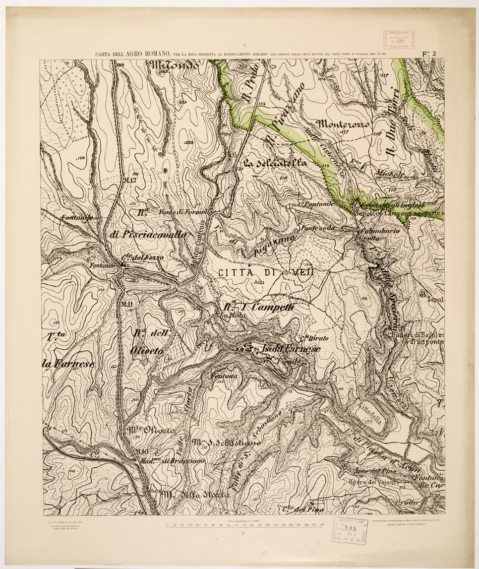 "...NEL RAPPORTO DI 1:8.000 PER LA ZONA SOGGETTA AL BONIFICAMENTO AGRARIO AGLI EFFETTI DELLE LEGGI RIUNITE IN TESTO UNICO CON R. D. NOVEMBRE 1905 N° 647. I.G.M., 1904. Ingrandimento fotozincografico in 77 fogli delle tavolette rilievo al 25.000. Stampa a colori in azzurro per le acque, verde per i limiti dell'agro romano, rosso per quelli della zona soggetta alla bonifica agraria, viola per il territorio suburbano di Roma, rosso per le tenute e le loro divisioni interne azzurro per le linee di spartiacque resto della planimetria in nero. Orografia a curve tracciate alla equidistanza di 5 metri. Annesso un quadro d'unione con elenco delle tenute private."