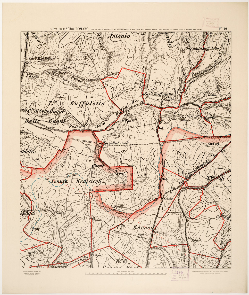 "...NEL RAPPORTO DI 1:8.000 PER LA ZONA SOGGETTA AL BONIFICAMENTO AGRARIO AGLI EFFETTI DELLE LEGGI RIUNITE IN TESTO UNICO CON R. D. NOVEMBRE 1905 N° 647. I.G.M., 1904. Ingrandimento fotozincografico in 77 fogli delle tavolette rilievo al 25.000. Stampa a colori in azzurro per le acque, verde per i limiti dell'agro romano, rosso per quelli della zona soggetta alla bonifica agraria, viola per il territorio suburbano di Roma, rosso per le tenute e le loro divisioni interne azzurro per le linee di spartiacque resto della planimetria in nero. Orografia a curve tracciate alla equidistanza di 5 metri. Annesso un quadro d'unione con elenco delle tenute private."