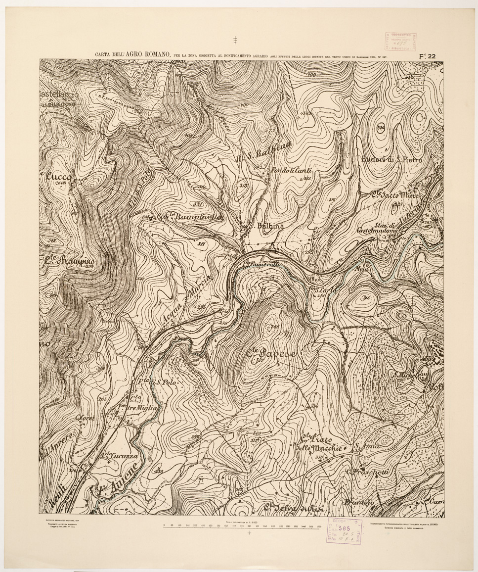 "...NEL RAPPORTO DI 1:8.000 PER LA ZONA SOGGETTA AL BONIFICAMENTO AGRARIO AGLI EFFETTI DELLE LEGGI RIUNITE IN TESTO UNICO CON R. D. NOVEMBRE 1905 N° 647. I.G.M., 1904. Ingrandimento fotozincografico in 77 fogli delle tavolette rilievo al 25.000. Stampa a colori in azzurro per le acque, verde per i limiti dell'agro romano, rosso per quelli della zona soggetta alla bonifica agraria, viola per il territorio suburbano di Roma, rosso per le tenute e le loro divisioni interne azzurro per le linee di spartiacque resto della planimetria in nero. Orografia a curve tracciate alla equidistanza di 5 metri. Annesso un quadro d'unione con elenco delle tenute private."