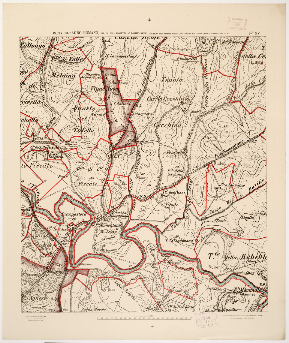 "...NEL RAPPORTO DI 1:8.000 PER LA ZONA SOGGETTA AL BONIFICAMENTO AGRARIO AGLI EFFETTI DELLE LEGGI RIUNITE IN TESTO UNICO CON R. D. NOVEMBRE 1905 N° 647. I.G.M., 1904. Ingrandimento fotozincografico in 77 fogli delle tavolette rilievo al 25.000. Stampa a colori in azzurro per le acque, verde per i limiti dell'agro romano, rosso per quelli della zona soggetta alla bonifica agraria, viola per il territorio suburbano di Roma, rosso per le tenute e le loro divisioni interne azzurro per le linee di spartiacque resto della planimetria in nero. Orografia a curve tracciate alla equidistanza di 5 metri. Annesso un quadro d'unione con elenco delle tenute private."