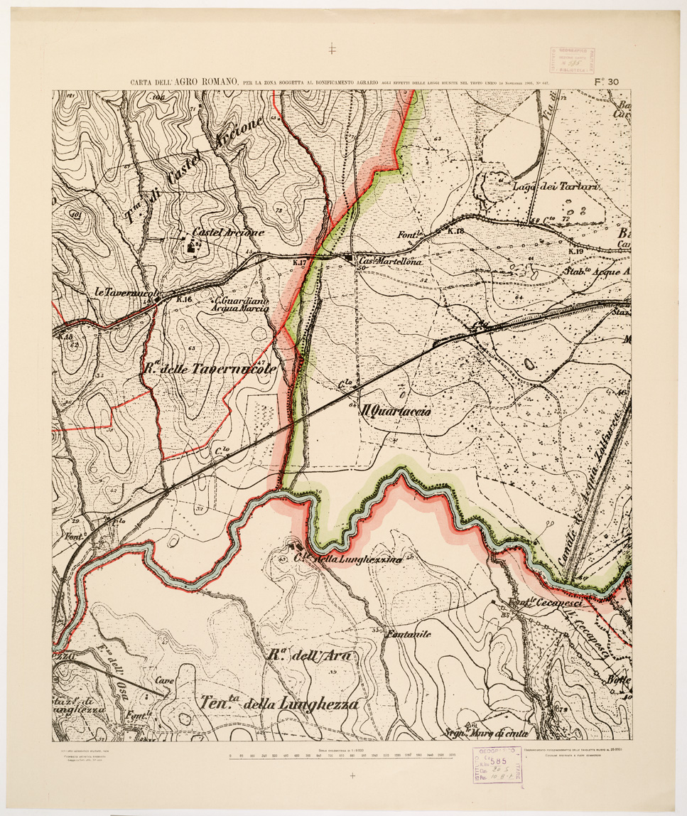 "...NEL RAPPORTO DI 1:8.000 PER LA ZONA SOGGETTA AL BONIFICAMENTO AGRARIO AGLI EFFETTI DELLE LEGGI RIUNITE IN TESTO UNICO CON R. D. NOVEMBRE 1905 N° 647. I.G.M., 1904. Ingrandimento fotozincografico in 77 fogli delle tavolette rilievo al 25.000. Stampa a colori in azzurro per le acque, verde per i limiti dell'agro romano, rosso per quelli della zona soggetta alla bonifica agraria, viola per il territorio suburbano di Roma, rosso per le tenute e le loro divisioni interne azzurro per le linee di spartiacque resto della planimetria in nero. Orografia a curve tracciate alla equidistanza di 5 metri. Annesso un quadro d'unione con elenco delle tenute private."