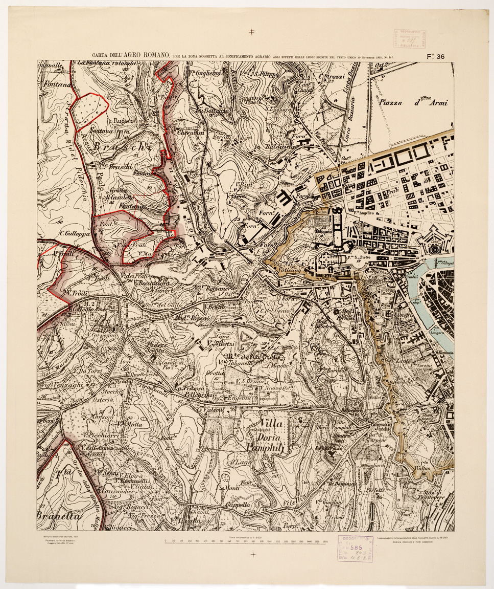 "...NEL RAPPORTO DI 1:8.000 PER LA ZONA SOGGETTA AL BONIFICAMENTO AGRARIO AGLI EFFETTI DELLE LEGGI RIUNITE IN TESTO UNICO CON R. D. NOVEMBRE 1905 N° 647. I.G.M., 1904. Ingrandimento fotozincografico in 77 fogli delle tavolette rilievo al 25.000. Stampa a colori in azzurro per le acque, verde per i limiti dell'agro romano, rosso per quelli della zona soggetta alla bonifica agraria, viola per il territorio suburbano di Roma, rosso per le tenute e le loro divisioni interne azzurro per le linee di spartiacque resto della planimetria in nero. Orografia a curve tracciate alla equidistanza di 5 metri. Annesso un quadro d'unione con elenco delle tenute private."