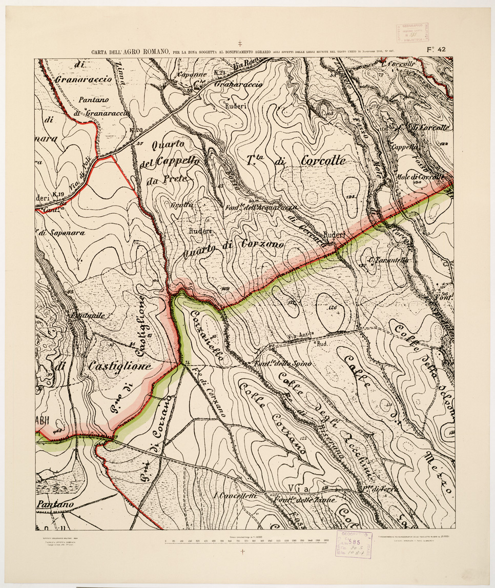 "...NEL RAPPORTO DI 1:8.000 PER LA ZONA SOGGETTA AL BONIFICAMENTO AGRARIO AGLI EFFETTI DELLE LEGGI RIUNITE IN TESTO UNICO CON R. D. NOVEMBRE 1905 N° 647. I.G.M., 1904. Ingrandimento fotozincografico in 77 fogli delle tavolette rilievo al 25.000. Stampa a colori in azzurro per le acque, verde per i limiti dell'agro romano, rosso per quelli della zona soggetta alla bonifica agraria, viola per il territorio suburbano di Roma, rosso per le tenute e le loro divisioni interne azzurro per le linee di spartiacque resto della planimetria in nero. Orografia a curve tracciate alla equidistanza di 5 metri. Annesso un quadro d'unione con elenco delle tenute private."