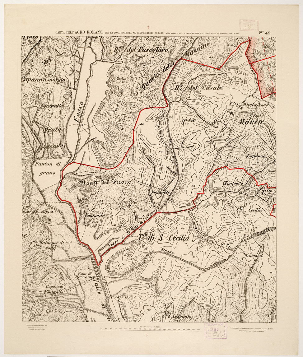 "...NEL RAPPORTO DI 1:8.000 PER LA ZONA SOGGETTA AL BONIFICAMENTO AGRARIO AGLI EFFETTI DELLE LEGGI RIUNITE IN TESTO UNICO CON R. D. NOVEMBRE 1905 N° 647. I.G.M., 1904. Ingrandimento fotozincografico in 77 fogli delle tavolette rilievo al 25.000. Stampa a colori in azzurro per le acque, verde per i limiti dell'agro romano, rosso per quelli della zona soggetta alla bonifica agraria, viola per il territorio suburbano di Roma, rosso per le tenute e le loro divisioni interne azzurro per le linee di spartiacque resto della planimetria in nero. Orografia a curve tracciate alla equidistanza di 5 metri. Annesso un quadro d'unione con elenco delle tenute private."