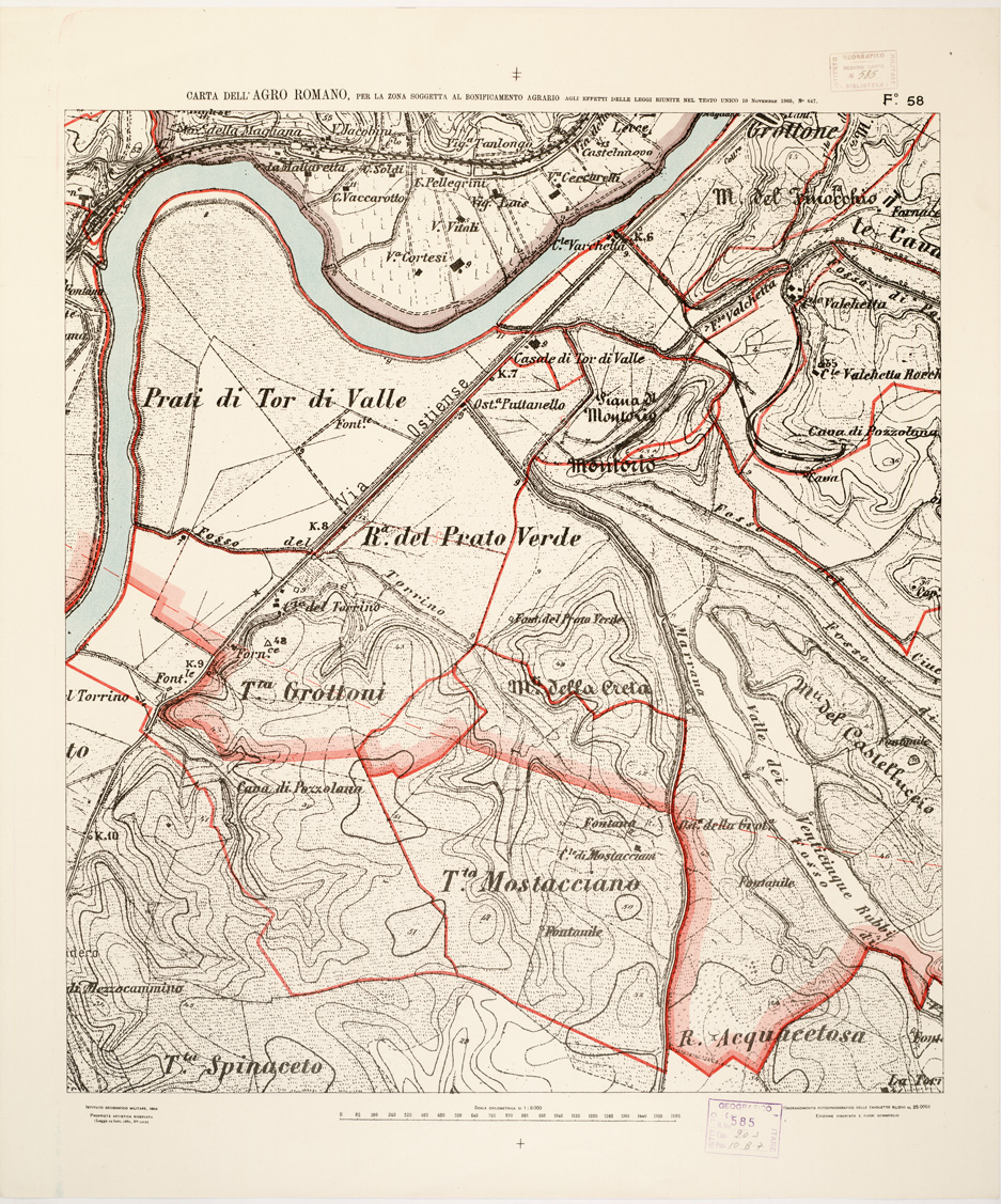 "...NEL RAPPORTO DI 1:8.000 PER LA ZONA SOGGETTA AL BONIFICAMENTO AGRARIO AGLI EFFETTI DELLE LEGGI RIUNITE IN TESTO UNICO CON R. D. NOVEMBRE 1905 N° 647. I.G.M., 1904. Ingrandimento fotozincografico in 77 fogli delle tavolette rilievo al 25.000. Stampa a colori in azzurro per le acque, verde per i limiti dell'agro romano, rosso per quelli della zona soggetta alla bonifica agraria, viola per il territorio suburbano di Roma, rosso per le tenute e le loro divisioni interne azzurro per le linee di spartiacque resto della planimetria in nero. Orografia a curve tracciate alla equidistanza di 5 metri. Annesso un quadro d'unione con elenco delle tenute private."