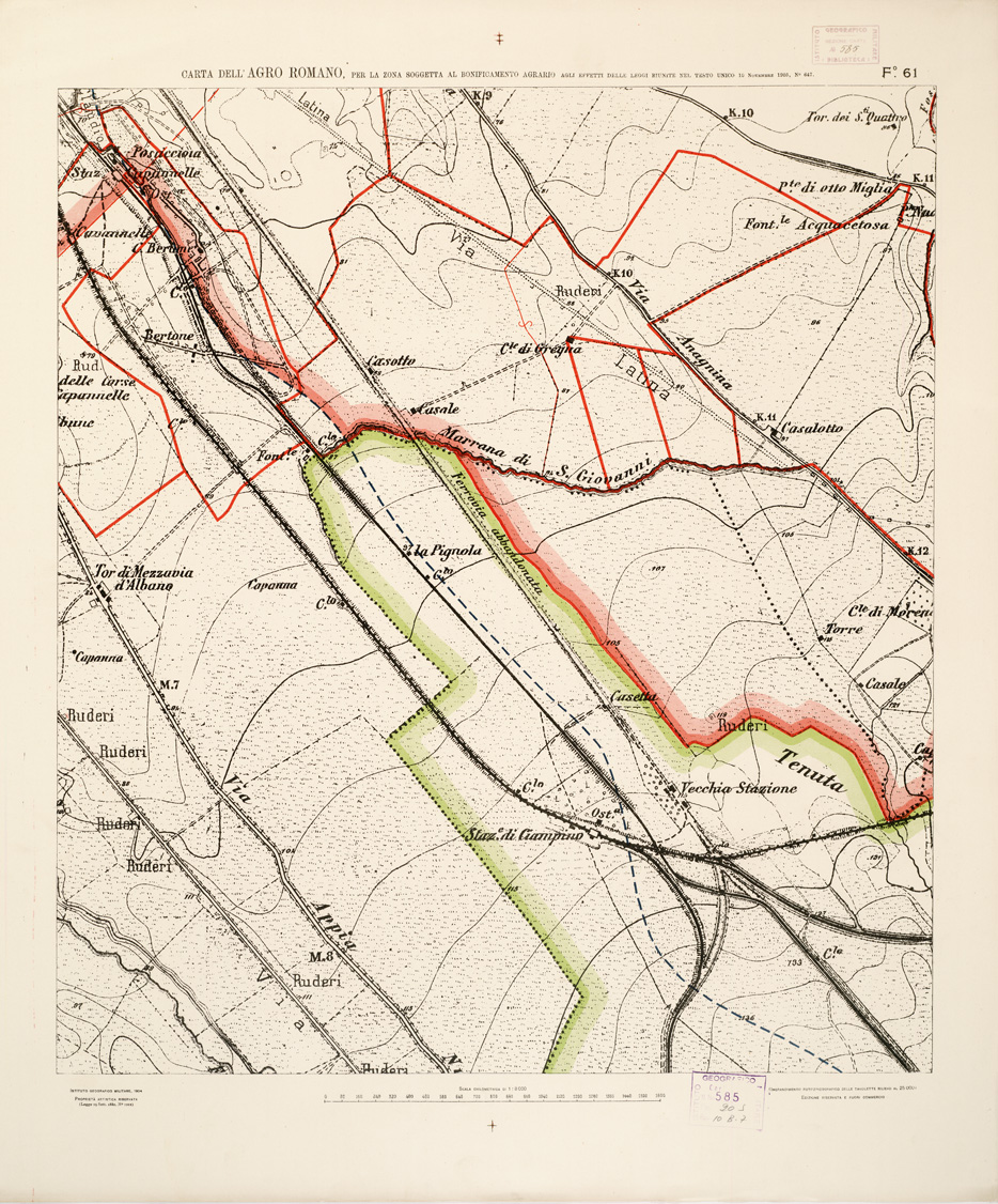"...NEL RAPPORTO DI 1:8.000 PER LA ZONA SOGGETTA AL BONIFICAMENTO AGRARIO AGLI EFFETTI DELLE LEGGI RIUNITE IN TESTO UNICO CON R. D. NOVEMBRE 1905 N° 647. I.G.M., 1904. Ingrandimento fotozincografico in 77 fogli delle tavolette rilievo al 25.000. Stampa a colori in azzurro per le acque, verde per i limiti dell'agro romano, rosso per quelli della zona soggetta alla bonifica agraria, viola per il territorio suburbano di Roma, rosso per le tenute e le loro divisioni interne azzurro per le linee di spartiacque resto della planimetria in nero. Orografia a curve tracciate alla equidistanza di 5 metri. Annesso un quadro d'unione con elenco delle tenute private."
