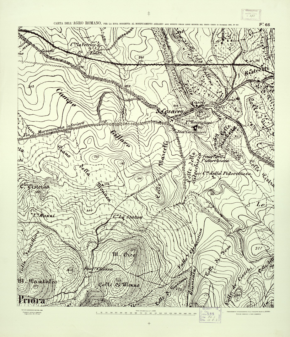 "...NEL RAPPORTO DI 1:8.000 PER LA ZONA SOGGETTA AL BONIFICAMENTO AGRARIO AGLI EFFETTI DELLE LEGGI RIUNITE IN TESTO UNICO CON R. D. NOVEMBRE 1905 N° 647. I.G.M., 1904. Ingrandimento fotozincografico in 77 fogli delle tavolette rilievo al 25.000. Stampa a colori in azzurro per le acque, verde per i limiti dell'agro romano, rosso per quelli della zona soggetta alla bonifica agraria, viola per il territorio suburbano di Roma, rosso per le tenute e le loro divisioni interne azzurro per le linee di spartiacque resto della planimetria in nero. Orografia a curve tracciate alla equidistanza di 5 metri. Annesso un quadro d'unione con elenco delle tenute private."