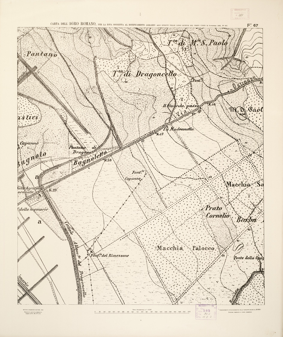 "...NEL RAPPORTO DI 1:8.000 PER LA ZONA SOGGETTA AL BONIFICAMENTO AGRARIO AGLI EFFETTI DELLE LEGGI RIUNITE IN TESTO UNICO CON R. D. NOVEMBRE 1905 N° 647. I.G.M., 1904. Ingrandimento fotozincografico in 77 fogli delle tavolette rilievo al 25.000. Stampa a colori in azzurro per le acque, verde per i limiti dell'agro romano, rosso per quelli della zona soggetta alla bonifica agraria, viola per il territorio suburbano di Roma, rosso per le tenute e le loro divisioni interne azzurro per le linee di spartiacque resto della planimetria in nero. Orografia a curve tracciate alla equidistanza di 5 metri. Annesso un quadro d'unione con elenco delle tenute private."