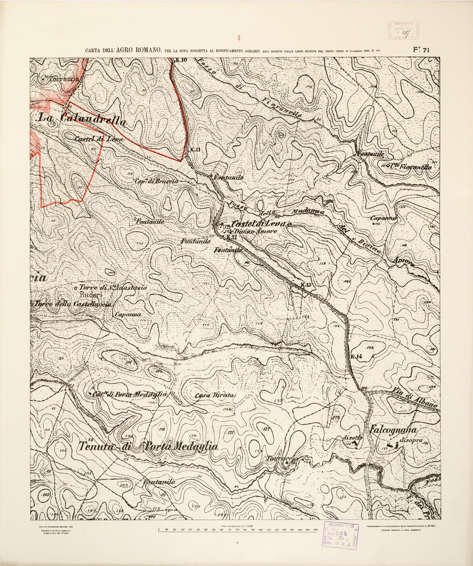 "...NEL RAPPORTO DI 1:8.000 PER LA ZONA SOGGETTA AL BONIFICAMENTO AGRARIO AGLI EFFETTI DELLE LEGGI RIUNITE IN TESTO UNICO CON R. D. NOVEMBRE 1905 N° 647. I.G.M., 1904. Ingrandimento fotozincografico in 77 fogli delle tavolette rilievo al 25.000. Stampa a colori in azzurro per le acque, verde per i limiti dell'agro romano, rosso per quelli della zona soggetta alla bonifica agraria, viola per il territorio suburbano di Roma, rosso per le tenute e le loro divisioni interne azzurro per le linee di spartiacque resto della planimetria in nero. Orografia a curve tracciate alla equidistanza di 5 metri. Annesso un quadro d'unione con elenco delle tenute private."