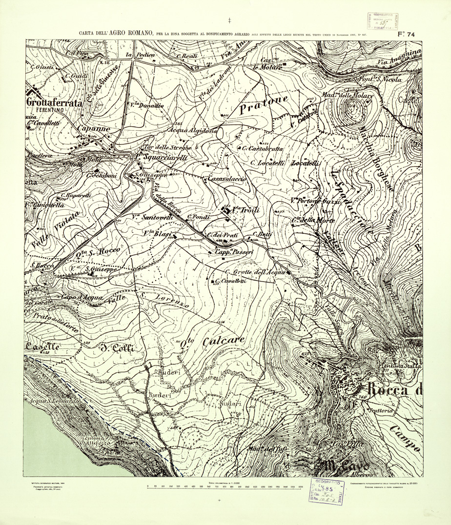 "...NEL RAPPORTO DI 1:8.000 PER LA ZONA SOGGETTA AL BONIFICAMENTO AGRARIO AGLI EFFETTI DELLE LEGGI RIUNITE IN TESTO UNICO CON R. D. NOVEMBRE 1905 N° 647. I.G.M., 1904. Ingrandimento fotozincografico in 77 fogli delle tavolette rilievo al 25.000. Stampa a colori in azzurro per le acque, verde per i limiti dell'agro romano, rosso per quelli della zona soggetta alla bonifica agraria, viola per il territorio suburbano di Roma, rosso per le tenute e le loro divisioni interne azzurro per le linee di spartiacque resto della planimetria in nero. Orografia a curve tracciate alla equidistanza di 5 metri. Annesso un quadro d'unione con elenco delle tenute private."