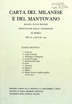 "...ESEGUITA DIETRO LE PIU' ESATTE DIMENSIONI GEOGRAFICHE ED OSSERVAZIONI ASTRONOMICHE. E' la celebre carta costruita dagli astronomi dell'Osservatorio di Brera, A. Cesaris, F. Reggio, B. Oriani, disegnata da C.Pinchetti e incisa da B.Bordiga. Si compone di otto fogli i cui rami trafugati a Vienna nel 1796,tornarono di proprietà dell'Osservatorio col ritorno dei francesi in Italia (1804) A Vienna, ove fu completata l'incisione della carta (foglio di Milano e dintorni),fu aggiunto anche il foglio titolo,inciso su rame più piccolo,senza indicazione di autori e di data. La carta è stampata in nero,con orografia dimostrata mediante artistico tratteggio.L'una copia è l'antico esemplare della carta senza titolo, rilegata in libro vi si aggiunge un secondo foglio sciolto di Milano e dintorni montato su tela a stacchi l'altra è la ristampa eseguita dall'I.G.M nel 1927 sui rami originali inviati da Brera.La carta che si trova in Biblioteca è proprio questa copia tratta dai rami originali inviati da Brera."