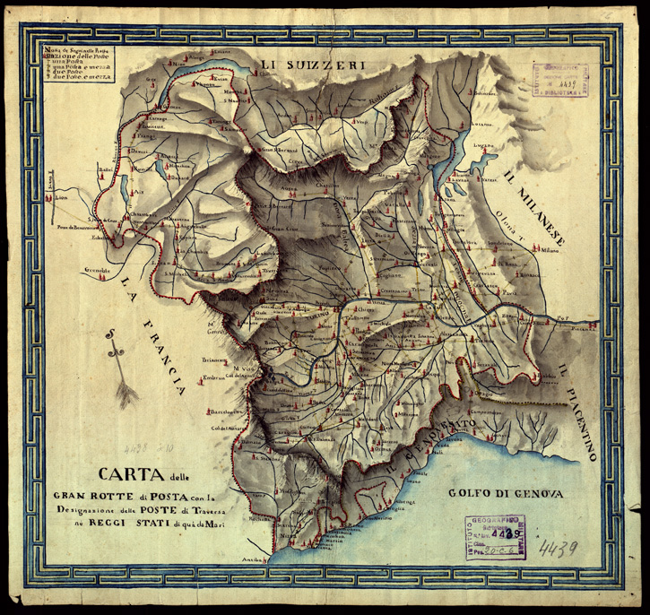 CARTA DELLE GRAN ROTTE DI POSTA CON LA DESIGNAZIONE DELLE POSTE DI TRAVERSA NE REGGI STATI DI QUA DA MARI.