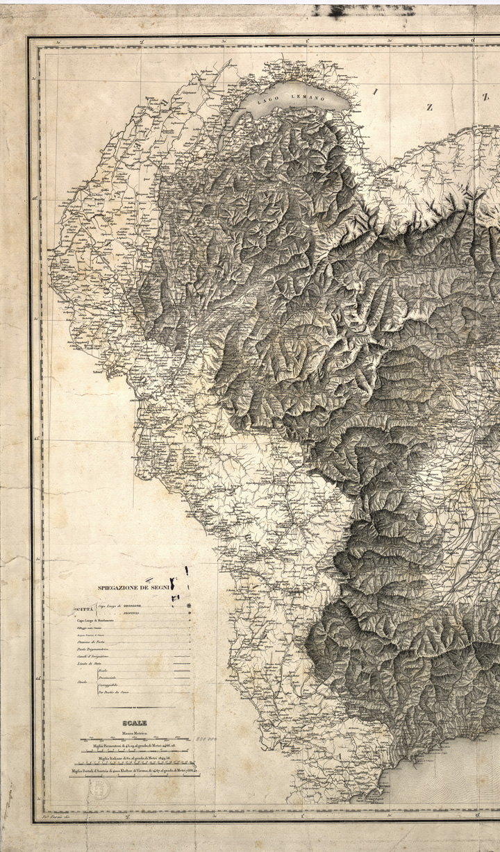 " Un foglio montato su tela,tratto da incisione su rame, stampato in nero, con orografia dimostrata a mezzo di fine tratteggio a luce obliqua. La carta distingue gli abitati in base alla loro importanza amministrativa, i comuni e le frazioni di comune, le stazioni di posta, i punti trigonometrici, i confini di stato, i canali di irrigazione le strade sono distinte in 6 classi (nazionali, provinciali, carreggiabili, per le bestie da soma, ferrate ordinarie, ferrate a cavalli). Scale grafiche in metri, miglia piemontesi, miglia italiane, miglia postali d'Austria. In basso a sinistra la legenda dei segni convenzionali. Incisore G. Capietti. Disegno di Paolo Burzio. (v. n. 89 e 90 d'ordine, Cartella d'Archivio n. 20 Documento n. 22, 23). La stessa carta è ai numeri d'inventario 51, 51 bis, 52, 4024, 4430."