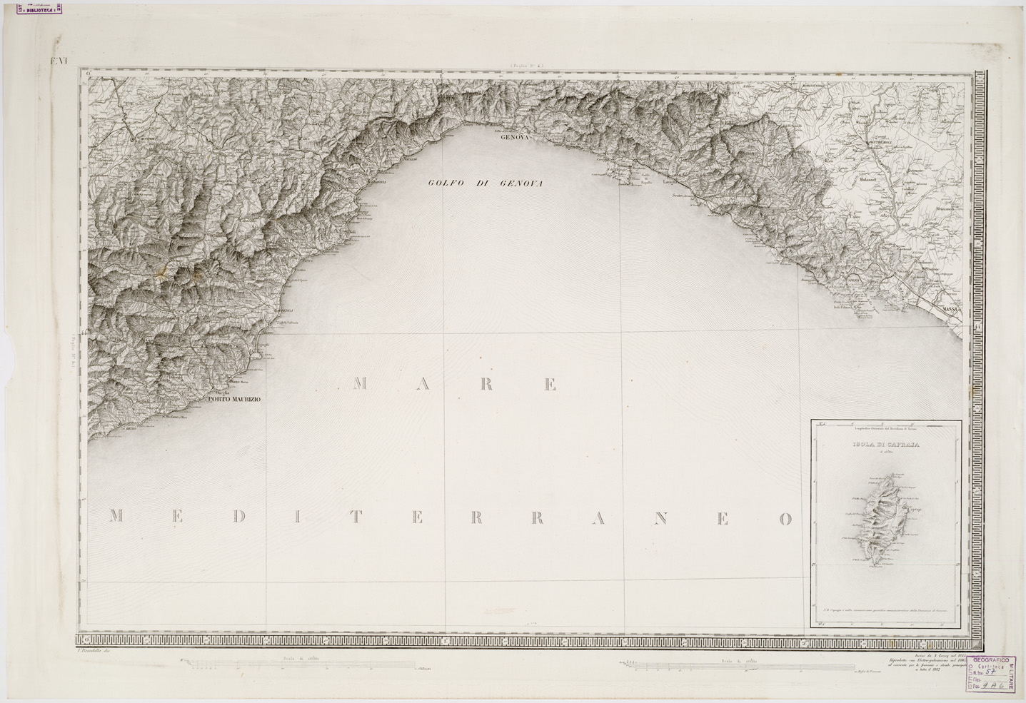 "...OPERA DEL REAL CORPO DI STATO MAGGIORE GENERALE. INCISA E PUBBLICATA L'ANNO 1841. Carta pregevolissima in sei fogli incisi su rame da A. Lecoq. G. Arghinenti, G. Biasoli, stampati in nero, riduzione della Carta Topografica in 90 fogli alla scala di 1 : 50 000 dello stesso R. Corpo di S. M. Generale. Proiezione di Flamstead modificata. Origine delle coordinate il R. Osservatorio di Torino. Orografia rappresentata con fine artistico tratteggio a luce obliqua. Abitati distinti in base alla loro importanza amministrativa strade classificate in reali, provinciali, carreggiabili, mulattiere e sentieri. Sono inoltre indicati ponti, argini, canali, acque termali, miniere, cave, ecc., e i confini di stato e di provincia. Il foglio N° 2 contiene il titolo e un " Cenno sulla formazione della carta ". Il foglio N° 5 contiene la leggenda dei segni convenzionali e le scale grafiche (8, in misure antiche italiane ed estere). Nel foglio N° 6 trovasi una cartina sussidiaria per l'isola di Capraia (Cfr. A. MORI, La Cartografia Ufficiale in Italia e l'I.G.M., 1922, pagg. 22-24). Cinque copie d'archivio quattro delle quali incise su rame (una mancante del foglio VI) ed una trasporto su pietra mancante del foglio IV. Gli esemplari n. 55, 55 bis, 57, 57 bis e 59 sono riproduzioni messe al corrente per gli anni 1859,1874,1883,1892 e 1898. L'originale è alla cartella d'archivio n. 40 documento n. 8."