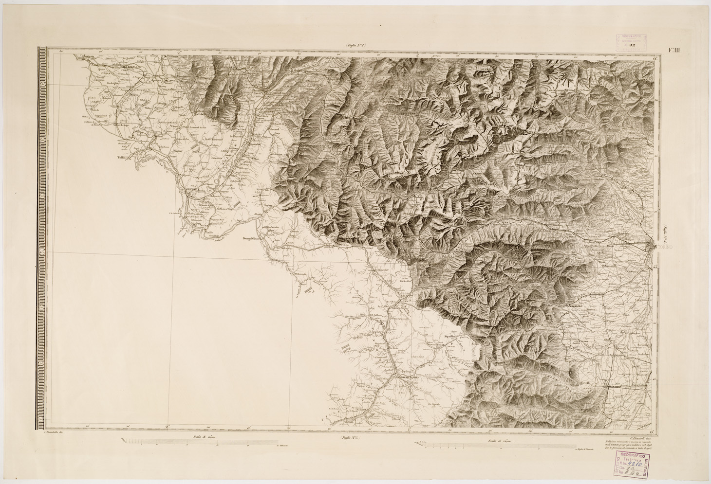 "...OPERA DEL REAL CORPO DI STATO MAGGIORE GENERALE. INCISA E PUBBLICATA L'ANNO 1841. Carta pregevolissima in sei fogli incisi su rame da A. Lecoq. G. Arghinenti, G. Biasoli, stampati in nero, riduzione della Carta Topografica in 90 fogli alla scala di 1 : 50 000 dello stesso R. Corpo di S. M. Generale. Proiezione di Flamstead modificata. Origine delle coordinate il R. Osservatorio di Torino. Orografia rappresentata con fine artistico tratteggio a luce obliqua. Abitati distinti in base alla loro importanza amministrativa strade classificate in reali, provinciali, carreggiabili, mulattiere e sentieri. Sono inoltre indicati ponti, argini, canali, acque termali, miniere, cave, ecc., e i confini di stato e di provincia. Il foglio N° 2 contiene il titolo e un " Cenno sulla formazione della carta ". Il foglio N° 5 contiene la leggenda dei segni convenzionali e le scale grafiche (8, in misure antiche italiane ed estere). Nel foglio N° 6 trovasi una cartina sussidiaria per l'isola di Capraia (Cfr. A. MORI, La Cartografia Ufficiale in Italia e l'I.G.M., 1922, pagg. 22-24). Cinque copie d'archivio quattro delle quali incise su rame (una mancante del foglio VI) ed una trasporto su pietra mancante del foglio IV. Gli esemplari n. 55, 55 bis, 57, 57 bis e 59 sono riproduzioni messe al corrente per gli anni 1859,1874,1883,1892 e 1898. L'originale è alla cartella d'archivio n. 40 documento n. 8."