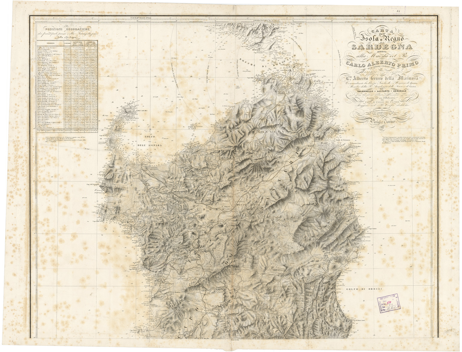 "Dedicata alla Maestà del Re Carlo Alberto Primo dal suo umilissimo e devotissimo suddito il Maggior Generale C.te Alberto Ferrero della Marmora, Comandante la Regia scuola di marina di Genova, Membro della R. Accademia delle Scienze di Torino già Colonnello -ajutante -Generale nel R. Corpo di Stato Maggiore Generale, assistito dal suo collaboratore * il cav. D. Carlo de Candia Maggiore nel R. Corpo suddetto. Incisa da Debuissons, Strada des bernardins, 24. Scritta da Arnoul impiegato al deposito della Guerra, addetto alla Carta di Francia_ Ibid. Paris e Torino, 1845. *Sui lavori trigonometrici e geodetici di questa carta incominciati nel 1824, e proseguiti quasi senza interruzioni sino al 1838, vedasi la notice inserita nel 1°vol 2 da Ediz (1839) del Voyage en sardaigne del medesimo autore. Parigi, presso Arthus Bertrand, strada Montefeuille, 23: e Chamerot, strada du jardinet, 13. La carta è una riedizione della carta del 1845, probabilmente dagli stessi rami. Rispetto all'edizione del 1845 alcuni riquadri sono stati eliminati. Nel foglio nord: - in alto a sinistra un riquadro con le coordinate geografiche dei principali punti della triangolazione della Sardegna. Il meridiano di riferimento è quello di Cagliari - Torre S. Pancrazio, - in alto a sinistra il titolo della carta con la dedica e la nota, Nel foglio sud: - Un riquadro con la "carta dimostrativa della riunione dei triangoli della Sardegna con quelli del Continente, passando per quei di Corsica", -in basso a sinistra la leggenda con i segni convenzionali e la Tavola di riduzione (per gli Scandagli) dei piedi parigini in Braccie ed in Metri, - in basso al centro quattro scale grafiche e numeriche, e l'avvertenza che " l'autore intende godere della Proprietà di questa carta, guarentita dalle Leggi e dai Trattati", -in basso a destra la Tavola di riduzione (per le Altitudini) dei metri in piedi Parigini, Pollici e Linee. - in alto a destra le informazioni sulla proiezione utilizzata e una tabella con i valori degli archi di longitudine e latitudine compresi nei fogli. Poi una lunga nota avverte sulle fonti utilizzate per la compilazione della carta."