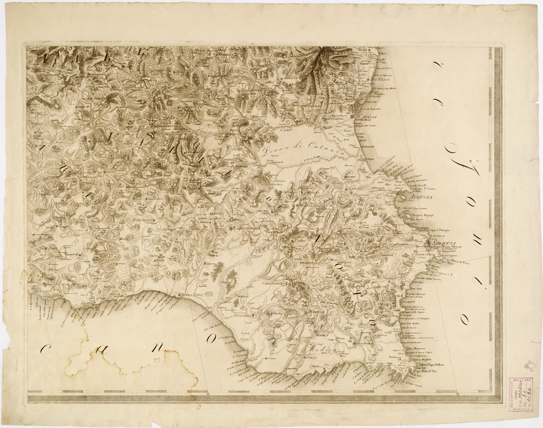 "RICAVATA DALL'ORIGINALE CARTA DEL BARONE DI SCHMETTAU E DALLE RICONOSCENZE ED OSSERVAZIONI DEGLI OFFICIALI DELL'OFFICIO TOPOGRAFICO DELLO STATO MAGG.RE GEN.LE PER ORDINE DI S. M. FERDINANDO IV RE DELLE DUE SICILIE DELINEATA ED INCISA PRESSO L'OFF. SUD.TO NEGLI ANNI 1809-1810. Carta in quattro fogli riuniti e montati su tela finemente incisa, basata su la revisione di quella dello Schmettau (v. n. 5 d'ordine, Cart. d'Arch. n. 97, n. d'Arch. 9092). Le ricognizioni tuttavia, eseguite con strumenti insufficienti, consentirono un miglioramento dell'originale, ma non permisero la creazione di una carta che rispondesse veramente alle nuove esigenze di esattezza. (Cfr. MORI A., La cartografia ufficiale in Italia e l'I.G.M., 1922). La copia posseduta reca tracciati a mano i confini a colori di 23 comarche: si suppone che possa trattarsi della delimitazione originale eseguita nel 1812 dal Canonico Piazzi per ordine del Governo della Sicilia. Confronta anche: col numero d'invent. 4664 la carta col medesimo titolo ai files B0012905-08 e al numero d'inv. 4664 ter. i files B0005202-03."