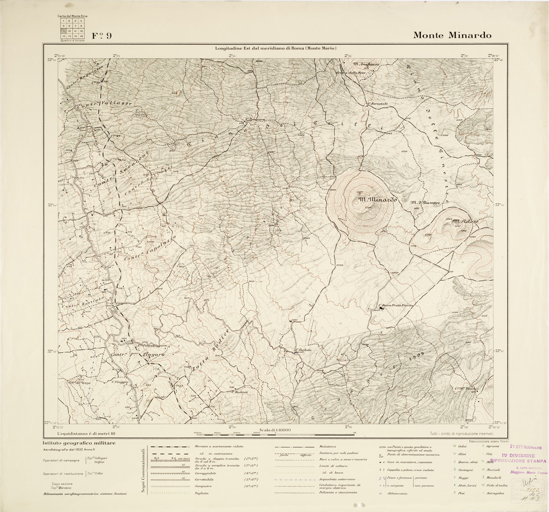 "Rappresentazione orografica a tratteggio e a curve di livello l'equidistanza è di metri 10. Rilevamento aerofotogrammetrico sistema Santoni. Fotozincoincisione sistema Ponzian. In basso sono presenti i segni convenzionali. I.G.M. (FI)."