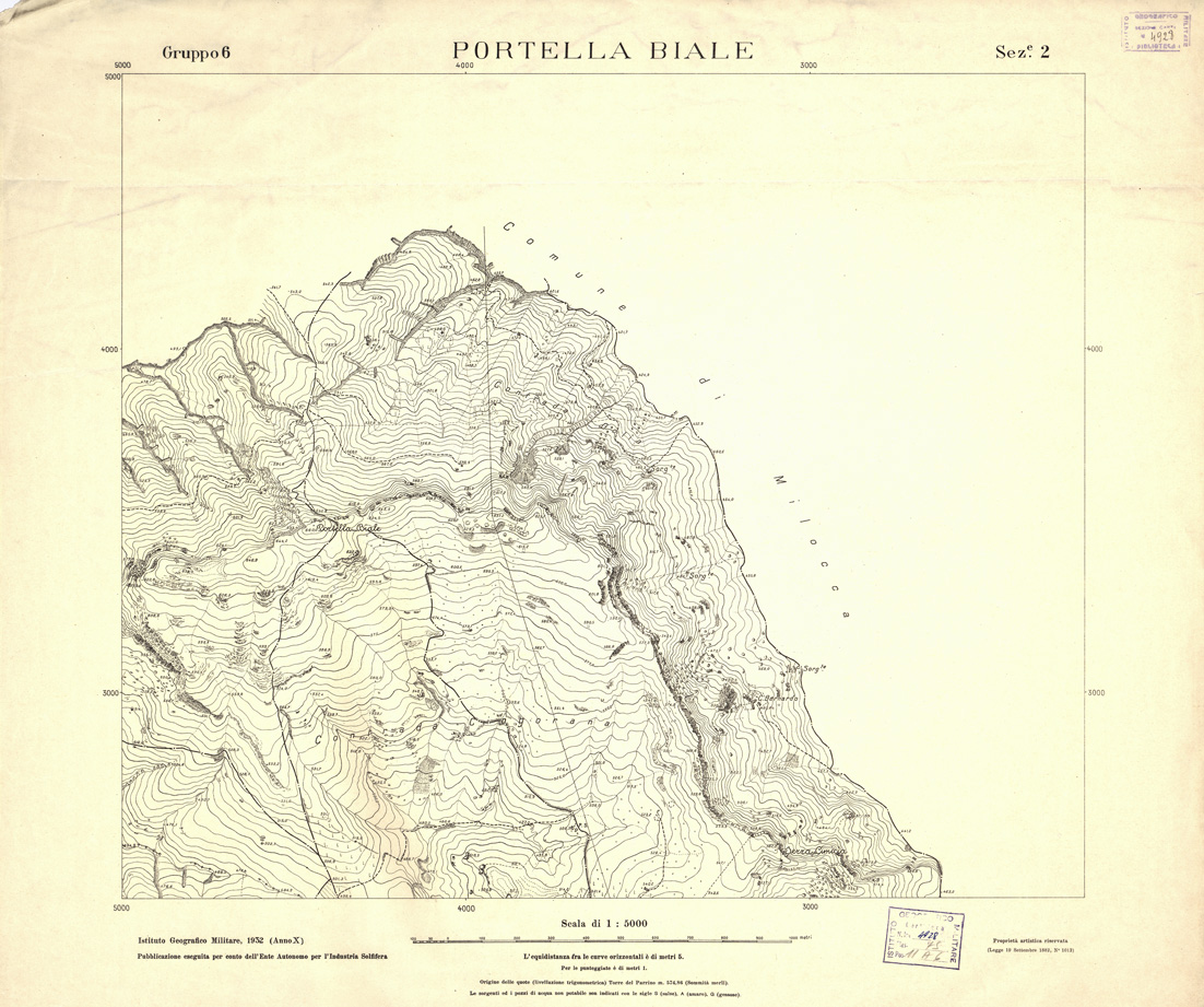 "Rappresentazione orografica a curve di livello l'equidistanza fra le curve orizzontali è di metri 5, per le punteggiate è di metri 1. Origine delle quote (livellazione trigonometrica) Torre del Parrino m. 574,86 (Sommità merli). Le sorgenti ed i pozzi di acqua non potabile sono indicate con le sigle S (salse), A (amare), G (gessose). I.G.M. (FI). Pubblicazione eseguita per conto dell'Ente Autonomo per l'Industria Solfifera."