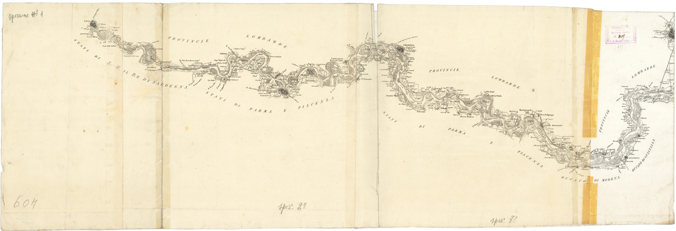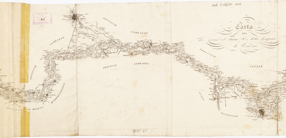 "Rappresenta il corso del Pò da Pavia al delta e la Laguna Veneta. Incisione su rame di F. Schonfelder in sette spezzoni con la sola planimetria lungo il corso del fiume. Cfr. ARRIGONI E BERTARELLI, Le carte geografiche dell'Italia, ecc., n. 3024."