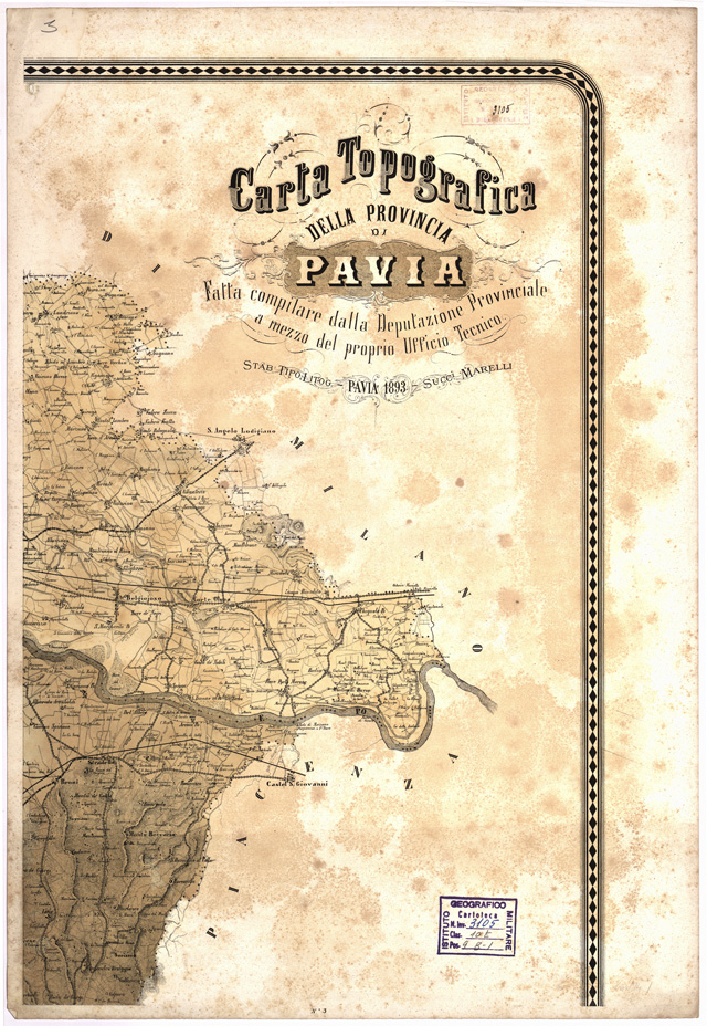 "...FATTA COMPILARE DALLA DEPUTAZIONE PROVINCIALE A MEZZO DEL PROPRIO UFFICIO TECNICO. STAB. TIPOLITOG. SUCC. MARELLI, PAVIA. Carta in 6 fogli, rappresentazione orografica a tratteggio. Nel foglio n. 4 sono presenti una pianta dellea città di Pavia alla scala di 1:6250, e le indicazioni principali di Pavia. Nel foglio n. 5 vi sono le distanze dei comuni dal capoluogo della provincia dal rispettivo circondario e mandamento. Nel foglio n. 6 sono presenti i segni convenzionali."