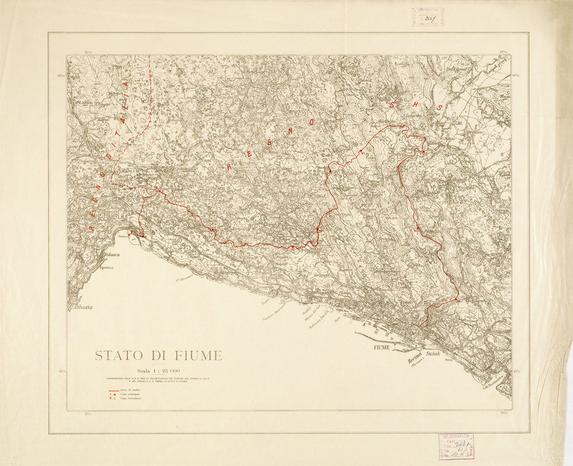 "...Commissione italo - S.H.S. per la delimitazione dei confini del Regno d' italia e del Regno S.H.S. verso lo Stato di Fiume. Un foglio stampato in tinta neutra riprodotto dalla carta austriaca al 25.000 con orografia a curve di livello e indicazione in rosso della linea di confine dei cippi principali e dei cippi triconfinali. Aut. ed Ed. I.G.M. (FI)."