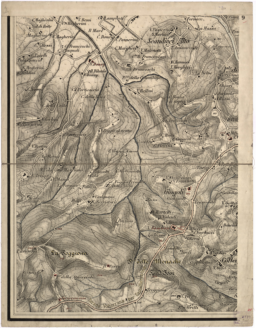 "...ALLA SCALA DI 1:7.500. 1876. Ingrandimento meccanico in 12 fogli montati su tela senza indicazione di autore. E' ritenuto però derivato dalla carta al 15.000 eseguita nel 1876 dagli Allievi dell' I.G.M. sotto la direzione del Sig. Moretti. Questa carta fu destinata a sostituire quella eseguita nel 1873 alla scala di 1:25.000 (vedi Catalogo Ragionato a pag. 333 Doc. N° 8765 e 8766, Cart. d' Arch. N° 66 e a pag. 334 Docum. 8768 Cart. d' Arch. N° 67). L' originale al 15.000 non è posseduto dall' Archivio dell' Istituto: se ne conserva bensì questo ingrandimento che documenta l' esattezza dei rilievi allora compiuti. L' orografia è rappresentata mediante tratteggio e curve di livello tracciate alla equidistanza di 10 metri. La carta mostra con ricchezza di dettagli, strade, abitati, costruzioni, corsi d' acqua, colture, ecc. Sono indicate le quote dei principali punti di elevazione."