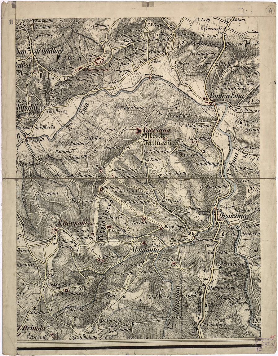 "...ALLA SCALA DI 1:7.500. 1876. Ingrandimento meccanico in 12 fogli montati su tela senza indicazione di autore. E' ritenuto però derivato dalla carta al 15.000 eseguita nel 1876 dagli Allievi dell' I.G.M. sotto la direzione del Sig. Moretti. Questa carta fu destinata a sostituire quella eseguita nel 1873 alla scala di 1:25.000 (vedi Catalogo Ragionato a pag. 333 Doc. N° 8765 e 8766, Cart. d' Arch. N° 66 e a pag. 334 Docum. 8768 Cart. d' Arch. N° 67). L' originale al 15.000 non è posseduto dall' Archivio dell' Istituto: se ne conserva bensì questo ingrandimento che documenta l' esattezza dei rilievi allora compiuti. L' orografia è rappresentata mediante tratteggio e curve di livello tracciate alla equidistanza di 10 metri. La carta mostra con ricchezza di dettagli, strade, abitati, costruzioni, corsi d' acqua, colture, ecc. Sono indicate le quote dei principali punti di elevazione."