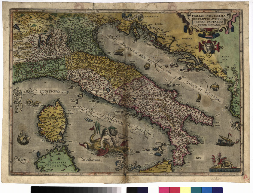 "Tav.I-2 - Ha per titolo "ITALIAE NOVISSIMA DESCRIPTIO AUCTORE JACOBO CASTALDO PEDEMONTANO" anno 1566. Carta artisticamente pregevole colorata con acquerello tinte diverse distinguono le varie regioni. Il Documento contiene 7 tavole dell'Atlante pubblicato nel 1570 da Abramo Ortelio, dotto geografo e sommo cartografo, detto il Tolomeo del suo secolo, amico di Gerardo Mercatore, nato ad Anversa nel 1527, morto nel 1598. Altre edizioni di questo Atlante si ebbero nel 1571, nel 1573, nel 1592 e nel 1595 in queste il numero delle tavole andò via via aumentando da 53 della edizione primitiva, a 115 in quella del 1595. Nel 1608 Filippo Pigafetta pubblicò ad Anversa una edizione italiana di 127 tavole. Le tavole della prima edizione sono state incise da Francesco Hogenberg. "