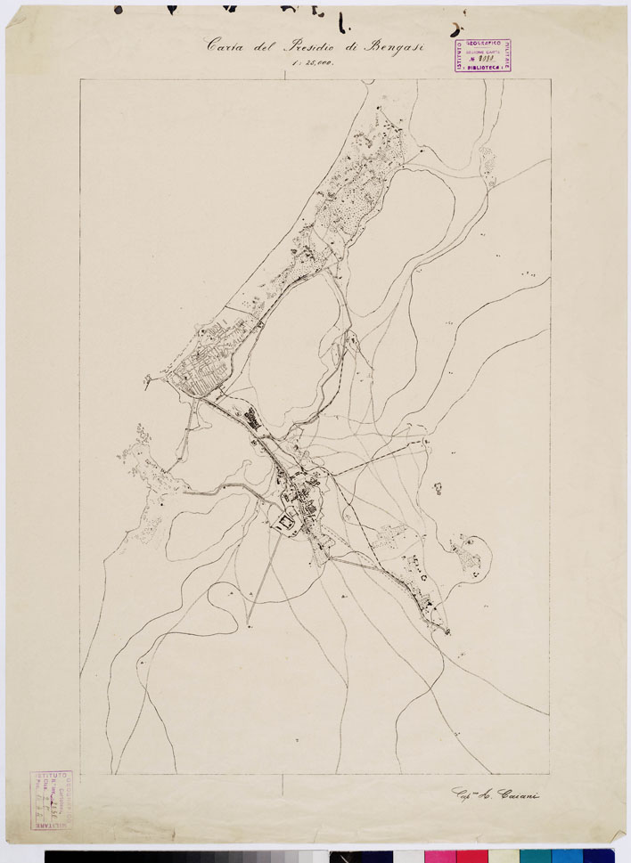 "Rilievo eseguito dal Cap. A. Caiani nel 1913. Vi è mostrata la sola planimetria. Stampa in nero. È uno dei lavori parziali affidati a ufficiali dell'I.G.M. messi a disposizione del Comando del Corpo di operazione durante l'occupazione militare."
