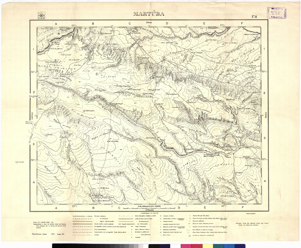 "Fogli N°: 6, 12, 13, 20, 21, 24, 25 (DRIANA, BOMBA, BENGASI, TÒBRUCK, UEL-HATIAN, BARDIA, AMSÉAT). Governo della Cirenaica. Ufficio Studi. Questa carta è fondata sulle campagne annuali di operatori concessi dall'I.G.M. al Governo della Cirenaica (Ufficio Studi) che procede al rilevamento del territorio stesso. Per la compilazione si sono incorporati anche i rilievi eseguiti dal 1919 in poi dall'I.G.M. (pubblicati alla scala di 1:50.000, ved. N° 16 d'ordine, N. 2454 d'inventario) per la fascia costiera da Bengasi a oltre Derna e nell'interno per una quarantina di km. Tali rilievi sono gradualmente ridotti e inquadrati nei fogli al 1:100.000 comprendenti 30' di longitudine per 20' di latitudine: il lavoro di ridisegno selezione e aggiornamento è fatto presso 1'Ufficio Studi la riduzione è fatta presso l'I.G.M. con sistema fotomeccanico. Le direttive per i rilievi sono date volta volta dall'Ufficio Studi del Governo che stabilisce la forma definitiva della toponomastica italiana e araba in base alle Norme emanate dal Ministero delle Colonie con Decreto I febbraio 1915. Ogni foglio è accompagnato dall'indice bilingue dei nomi contenuti. La carta viene stampata in nero. Le forme del rilievo sono rappresentate con curve di livello tracciate all'equidistanza di 10 metri. Le curve batometriche sono dedotte dagli scandagli della R. Marina. La carta mostra le ferrovie (ferrovia ordinaria, in costruzione, decauville), le strade (rotabile a fondo artificiale, carreggiabile a fondo naturale con parziali adattamenti, piste automobilistiche, comunicazioni non carreggiabili, sentiero) linee telegrafiche, limiti di stato e di commissariato, campi d'aviazione, zauie e moschee, marabutti (con fabbricato e senza), sinagoghe, cimiteri (cristiani, mussulmani ed ebraici), antichità, rovine, abitazioni trogloditiche, cisterne, pozzi e sorgenti, le zone allagate in periodo di piogge, gli uàdi, le località ove avvennero combattimenti, ecc."
