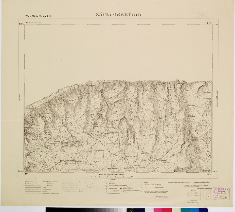 "I.G.M. Riprese nel 1919 le regolari operazioni di rilievo in Cirenaica, dopo l'interruzione del periodo bellico, servirono di punto di partenza, per i nuovi rilievi, le determinazioni astronomiche e geodetiche che già erano state eseguite fino dal 1912 a Bengasi e Derna dallo stesso I.G.M. Con le basi geodetiche già misurate in queste due località e una nuova misurata a es-Safsaf (sud-est di Cirene) si iniziava nel 1919 una nuova triangolazione alla quale si appoggiarono i nuovi lavori di rilievo. Le levate eseguite direttamente alla scala di 1:100.000 con procedimento grafico a mezzo della tavoletta pretoriana, adottando il sistema di proiezione naturale (come per le levate topografiche del Regno) in fogli di 30' di longitudine per 20' di latitudine, furono eseguite tenendo conto delle esigenze per un ingrandimento e un ridisegno al 50.000. La campagna topografica 1919-20 fruttava il rilievo di 6.000 kmq e nel 1921 vennero pubblicate 20 tavolette al 50.000 a cui si aggiunsero in seguito i tre quadranti (1923-24) del foglio di Bengasi. La zona rappresentata risulta quindi compresa tra Bengasi e Sidi Aon sulla costa e dal mare verso terra per una profondità di 40 km. La carta fu stampata in nero con l'adozione di speciali segni convenzionali rispondenti alle particolari condizioni della regione tenendo conto speciale della viabilità e della rete idrografica. Le forme del terreno sono rappresentate con curve di livello tracciate all'equidistanza di 10 metri. Questa carta dà una rappresentazione della Cirenaica ottima e porta un prezioso contributo alla morfologia della regione. Della carta furono pubblicate tre edizioni speciali a mostrare rispettivamente: 1) boschi e culture, 2) pozzi e cisterne, 3) i terreni (v. N° 17 d'ordine, N. 2685 d' inv.). La buona riduzione delle levate al 50.000 permise anche un ingrandimento al 25.000 in 60 fogli pure in nero (ved. N° 18 d'ordine, N. 4165 d' inventario). ."