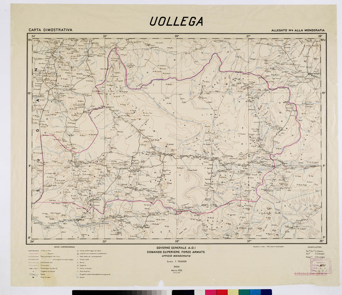 "In basso vi sono i segni convenzionali. Governo Generale A.O.I. Comando Superiore Forze Armate Ufficio Monografie. Riproduzione e stampa: Ufficio Superiore Topocartografico."