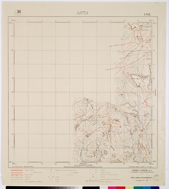 "Rilievo speditivo aereofotogrammetrico. Le curve sono dimostrative. In basso sono presenti i segni convenzionali. Comando Superiore A.O. 7^ Sezione Topocartografica."