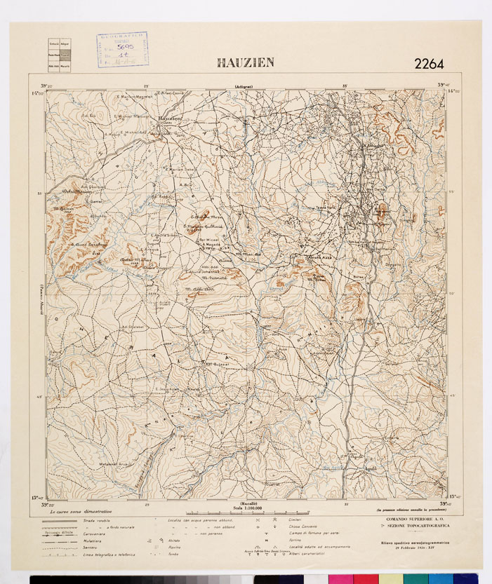 "Rappresentazione orografica a curve dimostrative. Rilievo speditivo aereofotogrammetrico. In basso vi sono i segni convenzionali. Comando Superiore A. O. 7^ Sezione Topocartografica."