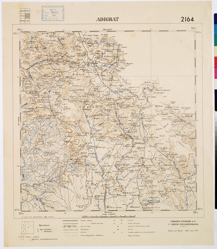 "Rappresentazione orografica a curve dimostrative. Rilievo speditivo grafico ed aereofotogrammetrico. In basso vi sono i segni convenzionali. Comando Superiore A. O. 7^ Sezione Topocartografica."