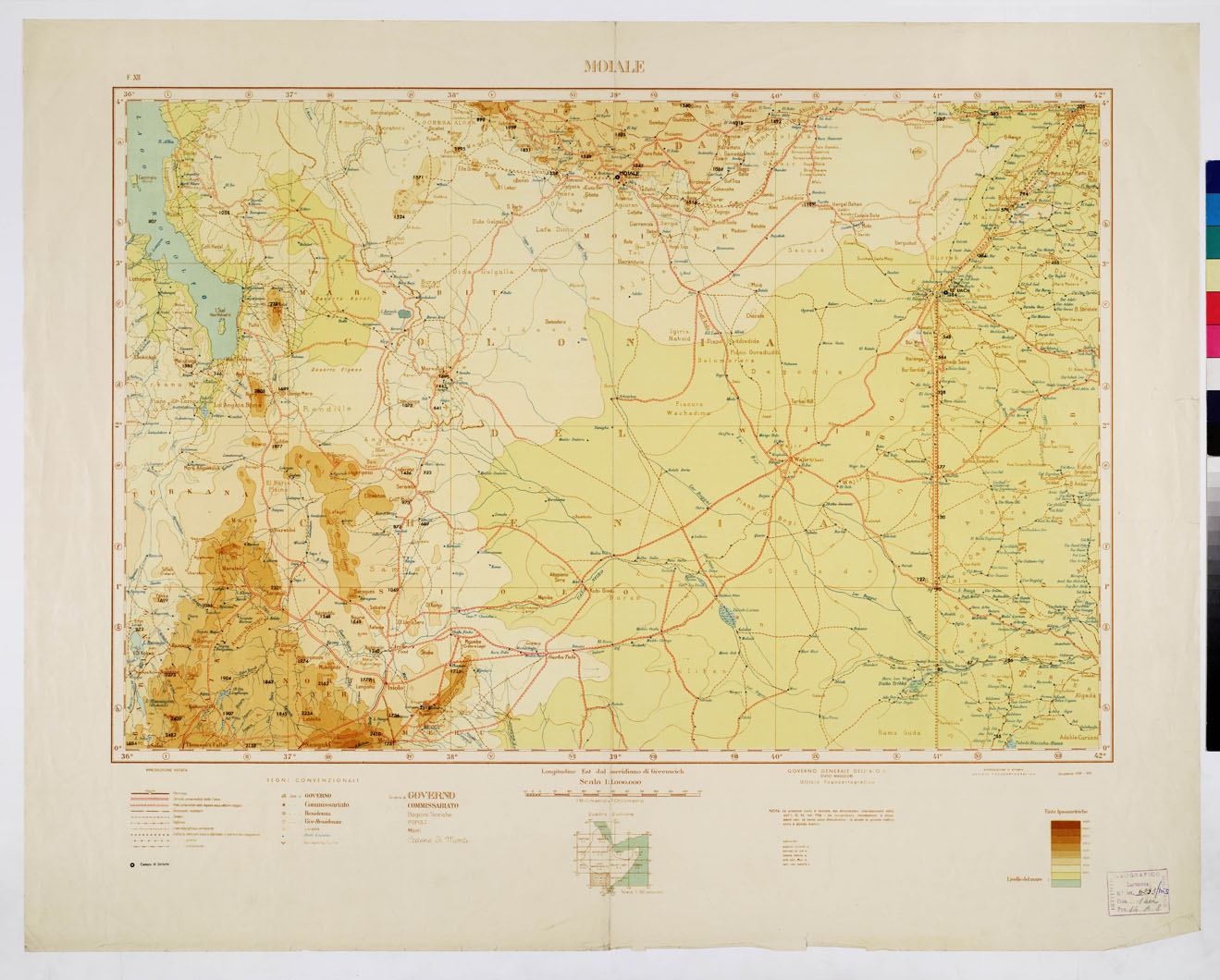 "La presente carta è dedotta dal milionesimo internazionale edito dall'I.G.M. nel 1936 da ricognizioni, da informazioni e documenti vari. Le curve sono dimostrative, le strade di grande traffico sono a sfondo bianco. La rappresentazione orografica è a tinte ipsometriche. In basso sono presenti: i segni convenzionali, la scala delle tinte ipsometriche e un quadro d'unione alla scala di 1:50.000.000. Governo Generale dell'A.O.I. Stato Maggiore, Ufficio Topocartografico."