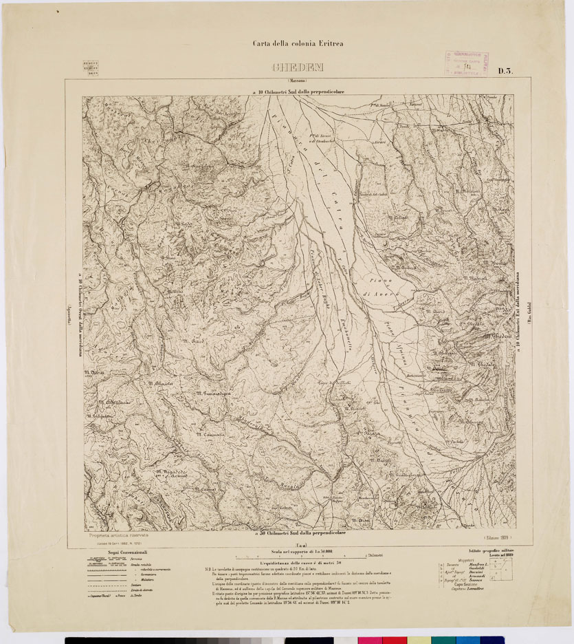 "I.G.M. Riproduzione fotozincografica dlee levate originali alla medesima scala tra gli anni 1885 e 1891. Questa carta comprende la parte centrale della Colonia Zula, Emberèmi, Giangheren e Himberti. La proiezione adottata fu quella del Cassini con centro di sviluppo la Cupola del Palazzo del Comando a Massaua la cui posizione geografica era stata determinata astronomicamente fin dal 1885 dalla R. Marina. La carta è in 26 fogli di m. 0,40 di lato, corrispondente quindi a 20 Km. sul terreno. La pubblicazione fu iniziata nel 1890 in edizione policroma (nero per la nomenclatura, le strade, le dune di sabbia azzurro per l'idrografia bistro per il terreno rosso per le quote trigonometriche) per i primi fogli e fu poi continuata in nero. In seguito la carta fu stampata interamente in nero. Nel 1909 fu allestita una nuova edizione in nero a curve di livello con equidistanza di 50 m. e numerose quote trigonometriche e topografiche. Fa eccezione il foglio Sciotel (rilevato dal Cap. Severi nel 1894) senza curve, con orografia a tratteggio. Nell'ultima edizione figurano in ciascun foglio i nomi dei mappatori e le date delle levate."